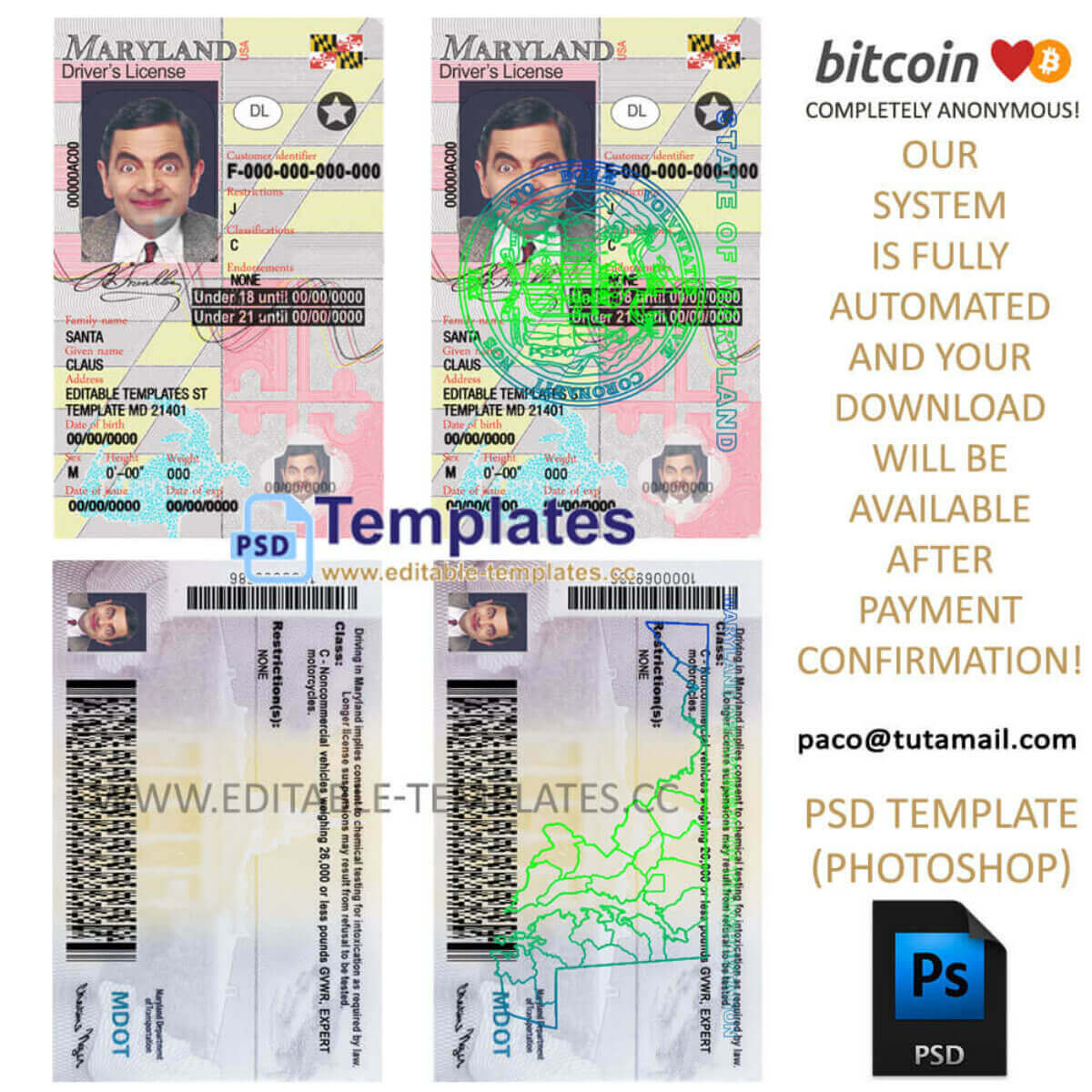 This Maryland U21 MD driving license template is a High quality template (1200 dpi). You can change the photo, number, name, address, birth date, expiry date, etc. (Fully editable, all fonts included)