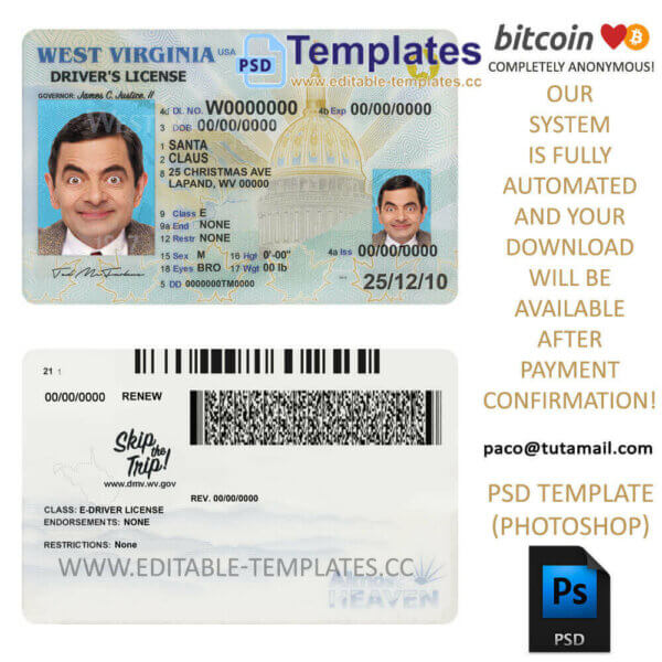 This West Virginia WV driving license template is a High quality template (1200 dpi). You can change the photo, number, name, address, birth date, expiry date, etc. (Fully editable, all fonts included)